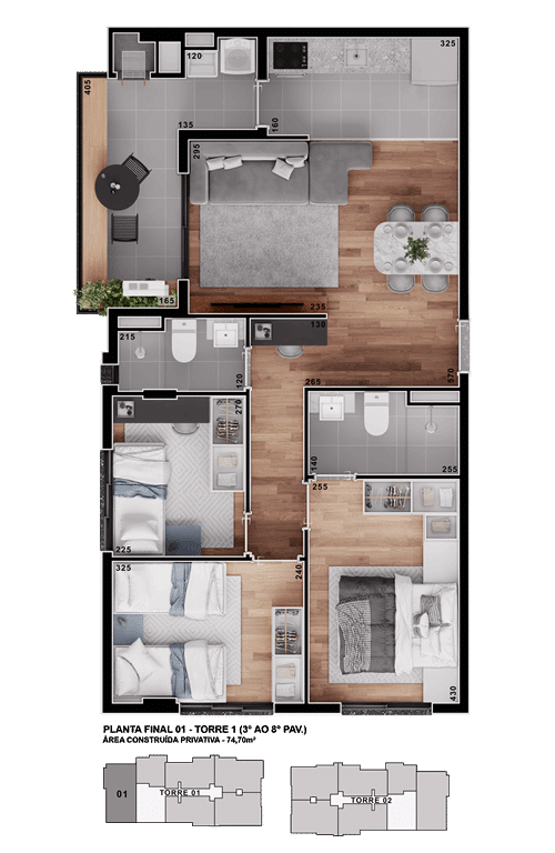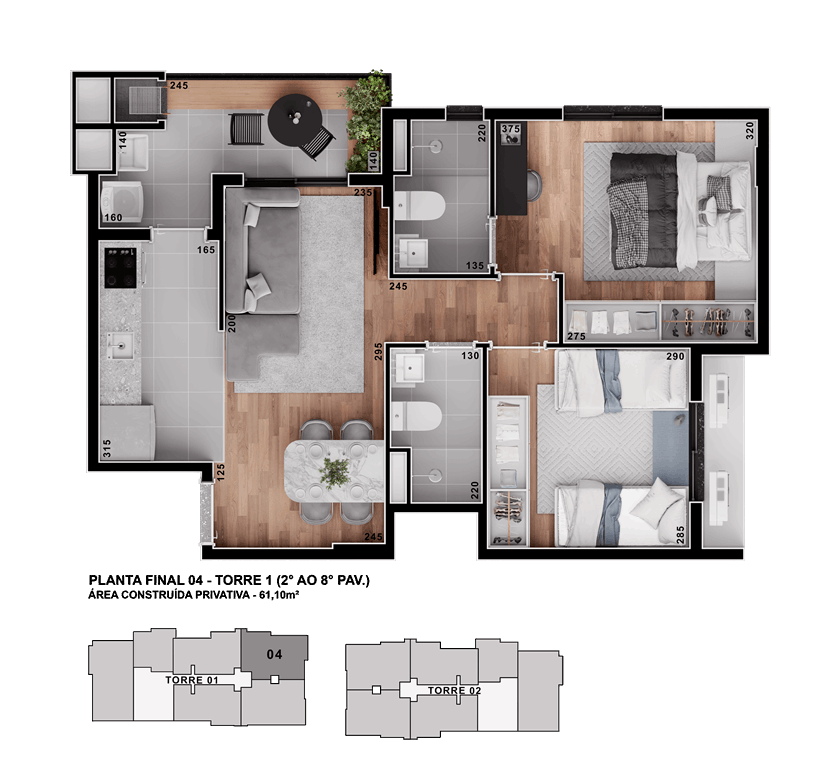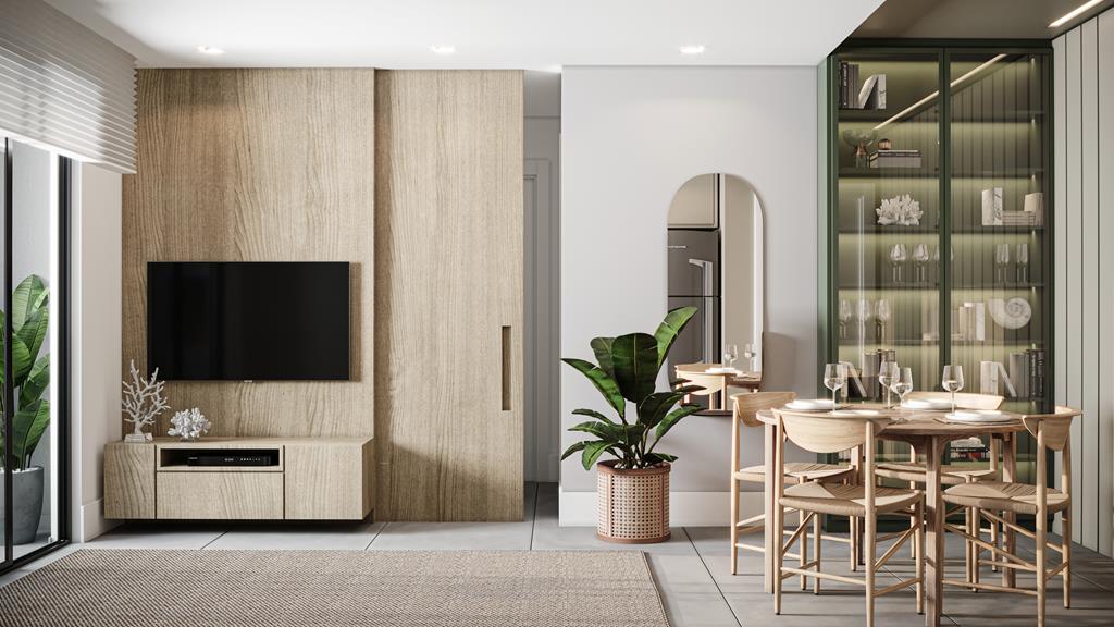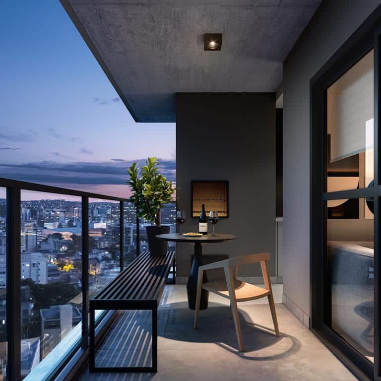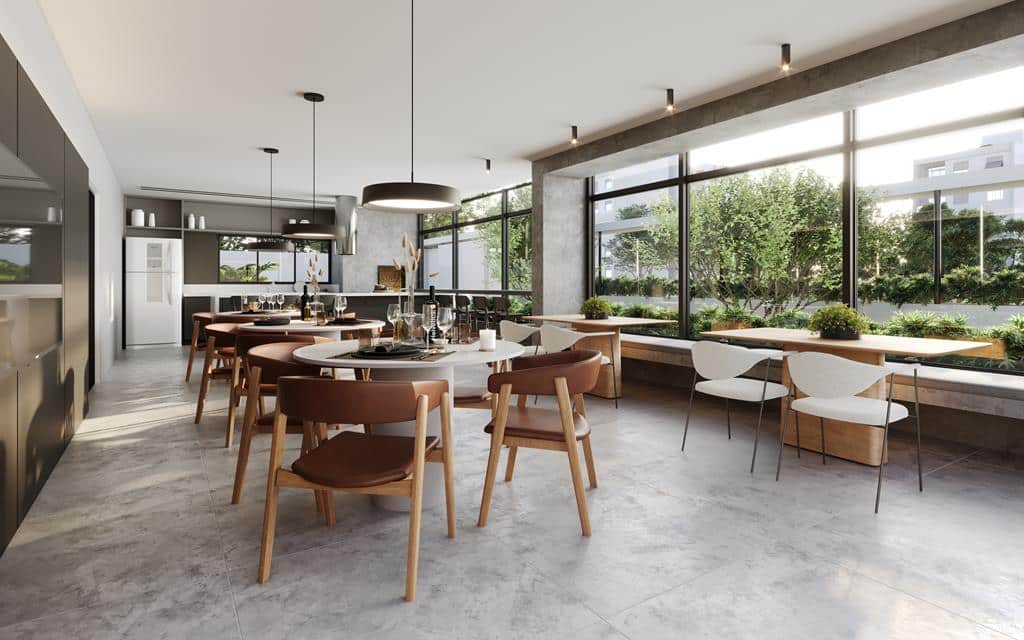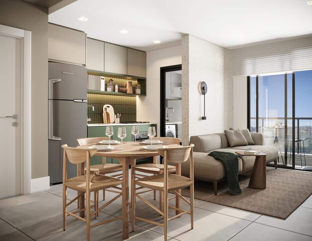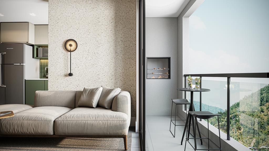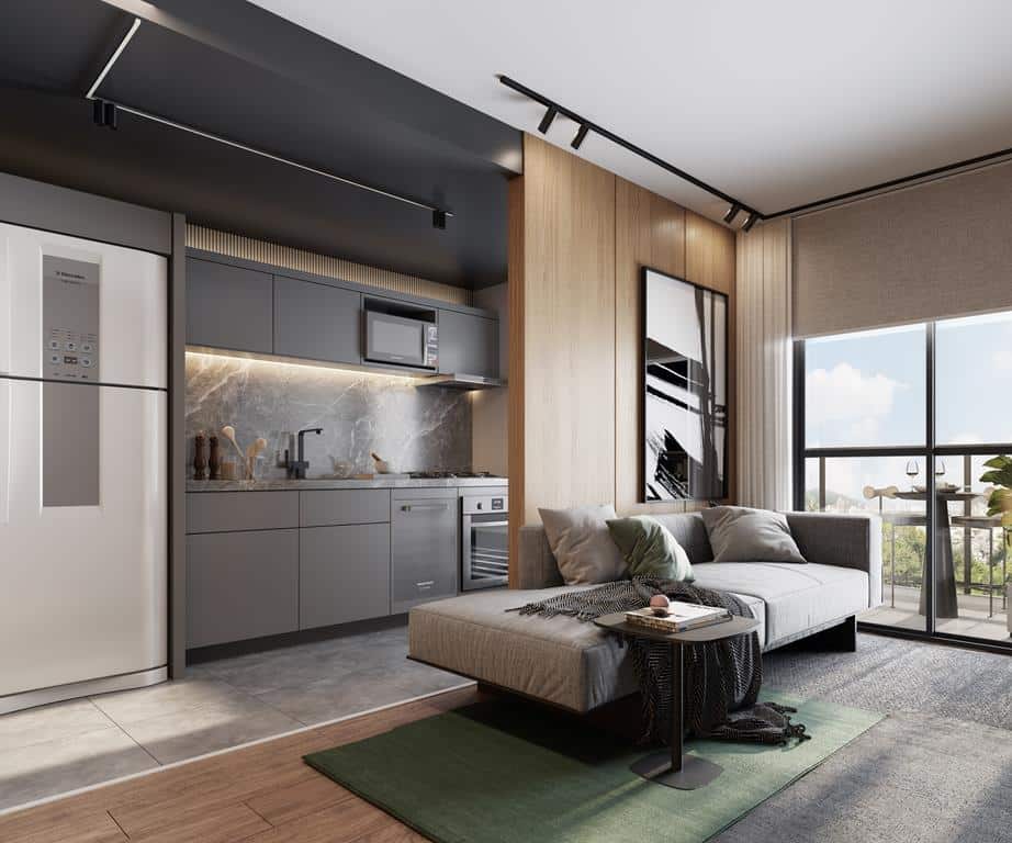 Unidades de 1 quarto com bancada em ilha e possibilidade para duplex.